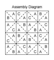 Arrange Squares as shown in Assembly Diagram, matching yarn color placements. Sew Squares into 4 strips of 4 Squares each. Sew strips together to make Blanket.