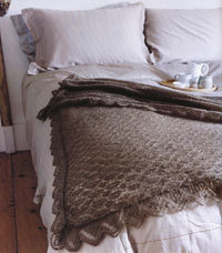 Talk about a lacy throw! This one is made with fine mohair yarn and size 8 needles plus a lace pattern on top of that. The chocolate brown color is pretty but I'm sure it would look good in any deep solid color. Or make it in white or aran and drape it over a dark color chair or couch.