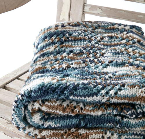 This Seascape Lace Knit Blanket Pattern has a gorgeous combo of blues and browns that looks just like a day at the seaside. The variegated jumbo yarn is super soft and cuddly, making this a cozy, touchable blanket knitting pattern you'll want to snuggle with on the couch for hours. The simple lace knitting pattern also adds just the right amount of texture and delicacy to the thick yarn used in this free knitting pattern. It will look gorgeous draped over the back of a sofa or chair and be oh-so-snuggly wrapped around your shoulders. And if the variegated yarn isn't for you, just substitute a solid color jumbo yarn of your choice.