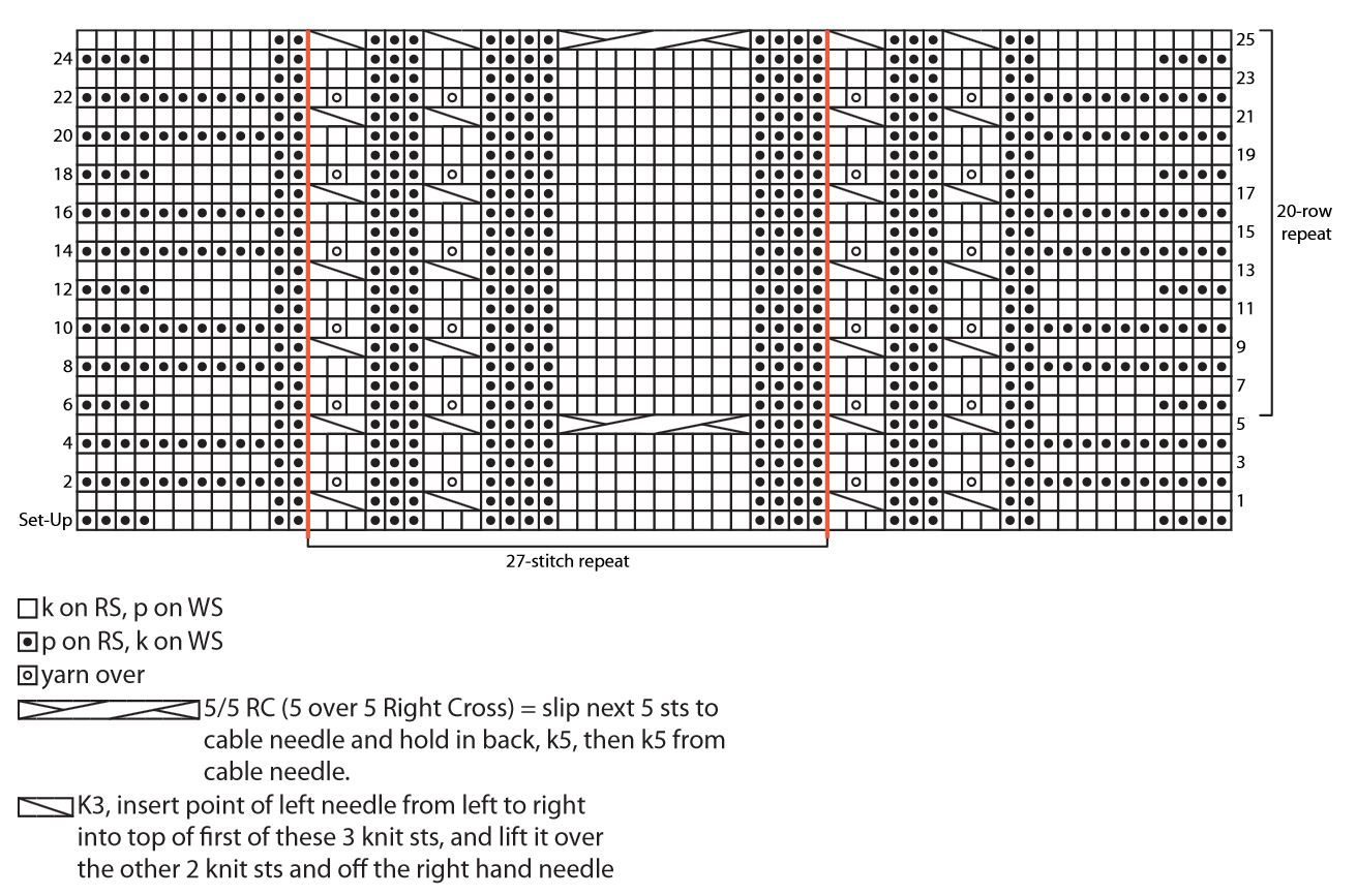 2. Cable pattern can be worked from written instructions or by following chart. Read Right Side rows of chart from right to left, and Wrong Side rows from left to right.