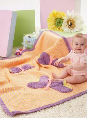 Fill her nursery with fluttering wings, happy smiles, and sunny days with this charming baby blanket knitting pattern. Baby's Butterfly Blanket is a simple, colorful pattern embellished with three dazzling butterfly appliques. Perfect for draping over cribs, rocking chairs, or even hanging on the wall, this cheerful baby blanket knitting pattern is more than just a cozy cover -- it's a work of art! Instead of turning to your go-to baby pattern, create something special with the Baby's Butterfly Blanket.