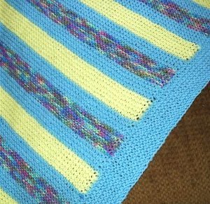 I'm always happy to see a pattern using mass market yarns and this one certainly fills that bill. The use of the multicolor yarn alternating with the solids make for an interesting and colorful baby blanket. I've read that it is good for babies to have colorful surroundings and this blanket surely conforms to that recommendation.