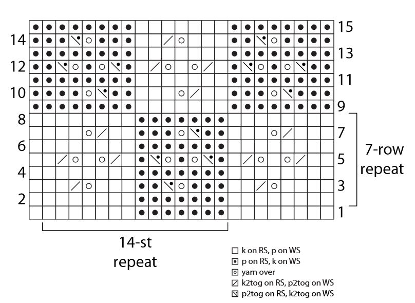 Row 5: K2, K2tog, yo, K1, yo, K2tog, K1; [P1, P2tog, yo, P1, yo, P2tog, P1, K1, K2tog, yo, K1, yo, K2tog, K1] eight times; K1.