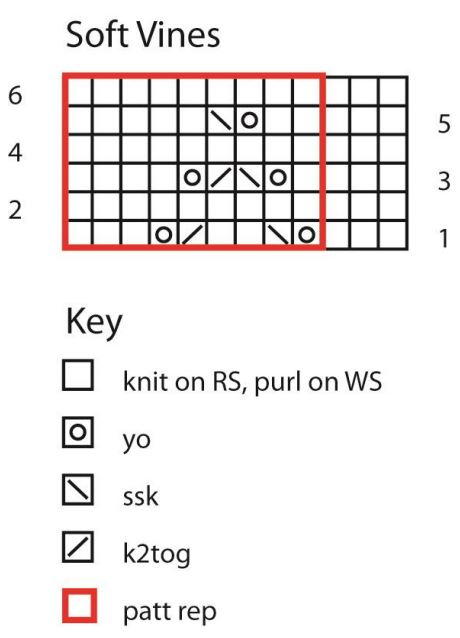 Row 1 (RS): Knit to marker, work Row 1 of Soft Vines patt to marker (patt will be repeated 8 times across row), knit to end. -