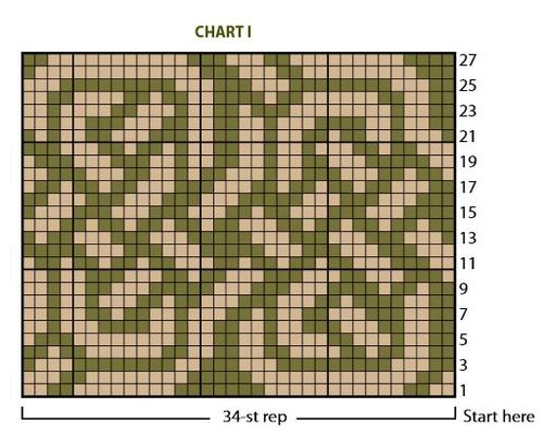 1st rnd: Knit 1st row of Chart I, reading row from right to left, noting 34-st rep will be worked 4 times. Chart I is now in position.