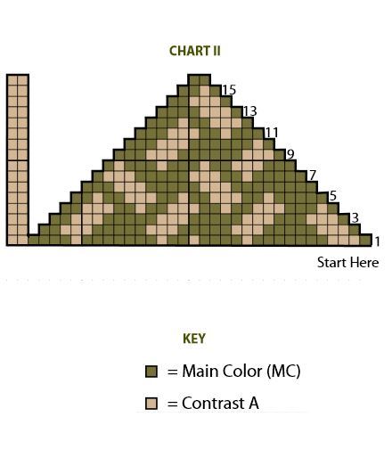 Note: When working from chart, carry yarn not in use loosely across WS of work but never over more than 5 sts. When it must pass over more than 5 sts, weave it over and under color in use on next st at center point of sts it passes over. The colors are never twisted around one another.