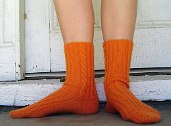 Although this is a basic cabled sock pattern it is also a classic look that everyone you make it for will like. I love the orange but I'm sure they would look great in whatever color you chose. I think a solid color would be best to show off the cable patterns.