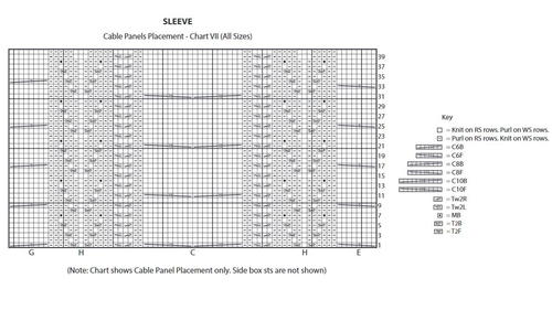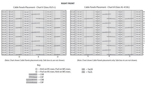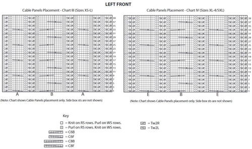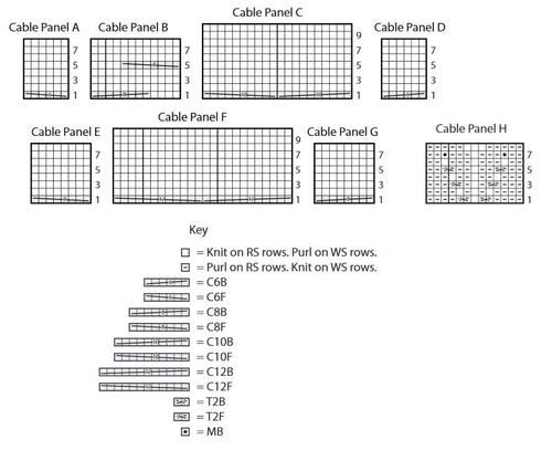 1st row: (RS). K0 (0-1). P2 (0-2). (K2. P2) 6 (8-9) times. (Tw2R. Tw2L. P2) twice. Work 1st row of Cable Panel E. P2. Tw2R. Tw2L. P2. Work 1st row of Cable Panel B. P2. Tw2R. Tw2L. P2. Work 1st row of Cable Panel F. P2. Tw2R. Tw2L. P2. Work 1st row of Cable Panel B. P2. Tw2R. Tw2L. P2. Work 1st row of Cable Panel G. (P2.Tw2R. Tw2L) twice. (P2. K2) 6(8-9) times. P2 (0-2). K0 (0-1).