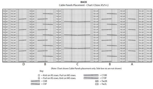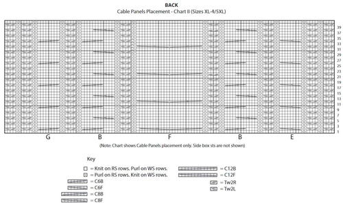 2nd row: P0 (0-1). K2 (0-2). (P2. K2) 6(8-9) times. (P4. K2) twice. Work 2nd row of Cable Panel G. K2. P4. K2. Work 2nd row of Cable Panel B. K2. P4. K2. Work 2nd row of Cable Panel F. K2. P4. K2. Work 2nd row of Cable Panel B. K2. P4. K2. Work 2nd row of Cable Panel E. (K2. P4) twice. (K2. P2) 6 (8-9) times. K2 (0-2). P0 (0-1).