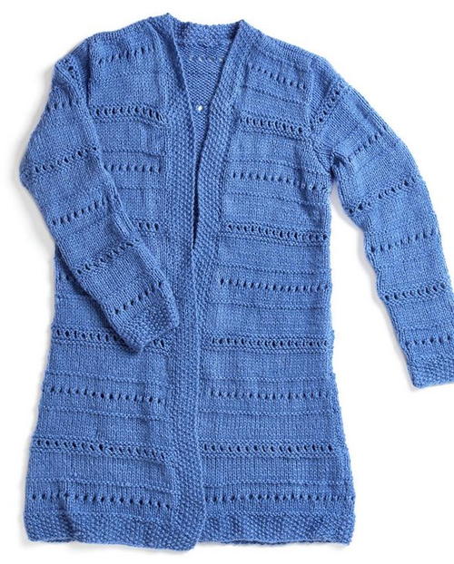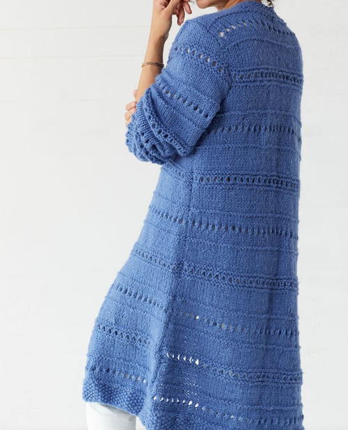 The Cornflower Knit Cardigan Pattern is easy to love because of its forgiving shape, its breezy construction, and its trendy color. Free knit cardigan patterns at thislength are hard to find, but they are so beloved because of the effortless, drapey look they produce and the extra warmth they provide, whether you're sitting in an overly air-conditioned office or trudging through the winter snow. The gorgeous seed stitch border along the open front and the hem takes a bit longer to complete, but the beautiful effect is worth the extra time taken.