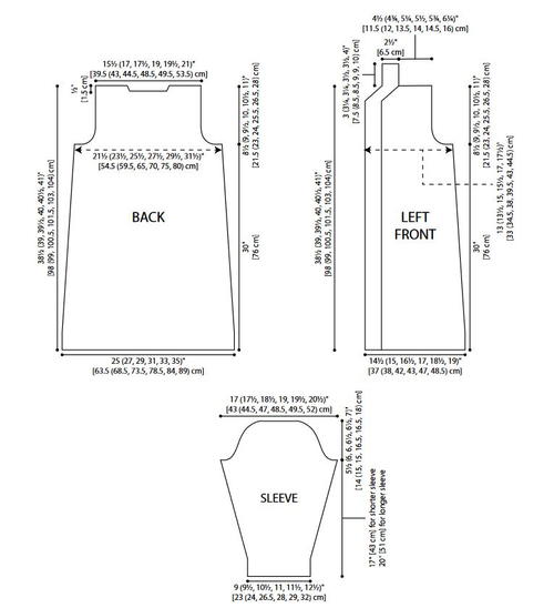 Back, fronts, and sleeves can be worked with straight needles or circular needle. If you choose to use a circular needle, work back and forth in rows on circular needle as if working with straight needles.