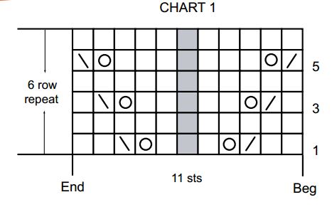 Next Row: K11 (15, 19, 25, 31), p1, place marker, work Row 1 of Chart 1 over next 11 sts, place marker, work Row 1 of Chart 2 over next 18 sts, place marker, p1, k2.