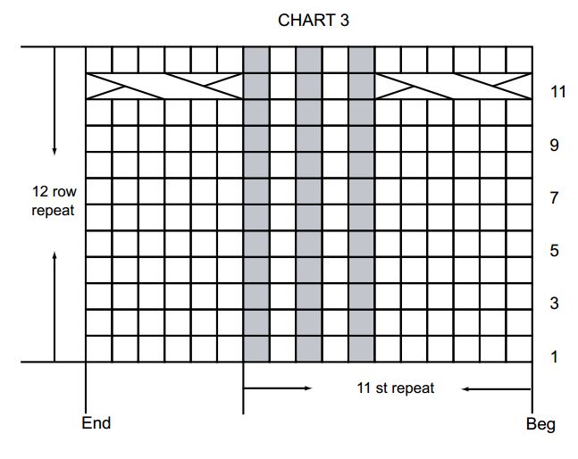 K7 (11, 11, 11, 11) sts, place marker, work Row 1 of Chart 3 over next 50 (50, 50, 61, 61) sts, place marker, k7 (11, 11 ,11 ,11) sts.