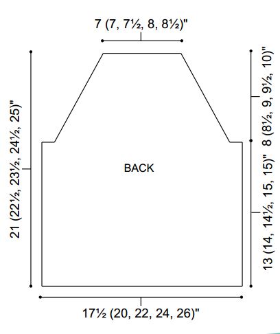 Work in patterns as established until piece measures 13 (14, 14½, 15, 15)” from beginning, end by working a right side row.