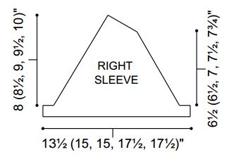 Repeat dec row every right side row 13 (11, 10, 18, 17) times more, then every other right side row 5 (7, 8, 5, 6) times AND AT THE SAME TIME when piece measures 7 (7½, 8, 8½, 9)” from beginning, end by working a right side side row, shape top of sleeve by bind off 3 sts at beginning of next row, then bind off 2 sts at same edge every wrong side row 2 times, then dec 1 st at same edge every wrong side row 4 (4, 4, 4, 4) times. Bind off remaining 3 (3, 3, 4, 4) sts