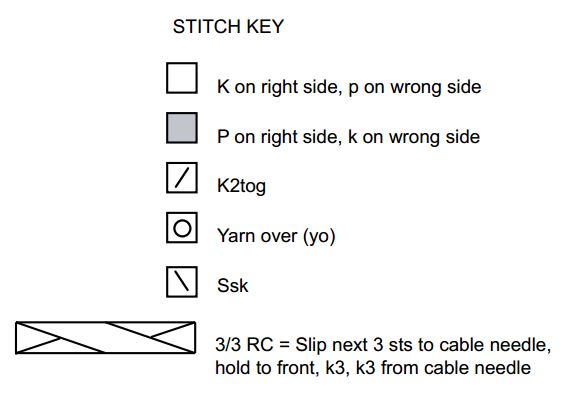 3/3 LC = Slip next 3 sts to cable needle, hold to front; k3; k3 from cable needle.