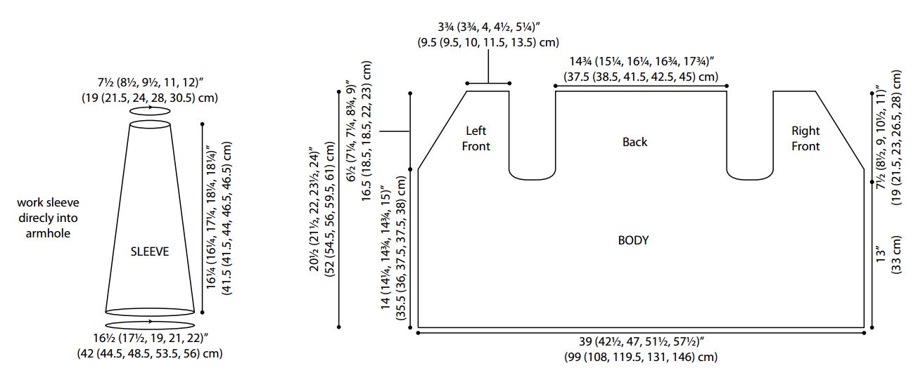 Finished Bust: 39 (42½, 47, 51½, 57½)” [99 (108, 119.5, 131, 146) cm], not including front bands