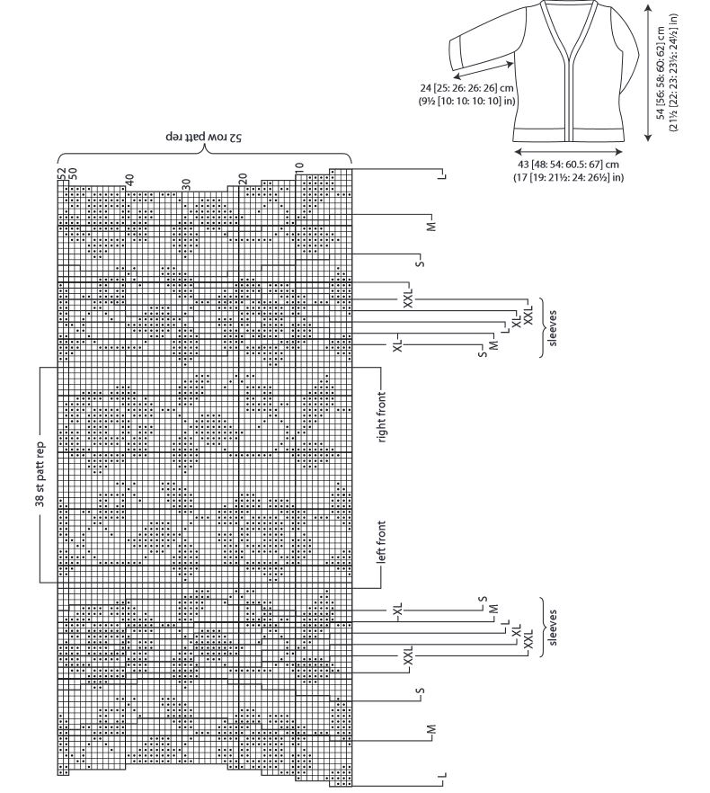 Beg and ending rows as indicated and repeating the 38 st patt rep 1 [1: 1: 2: 2] times across each row, cont in patt from chart as folls: