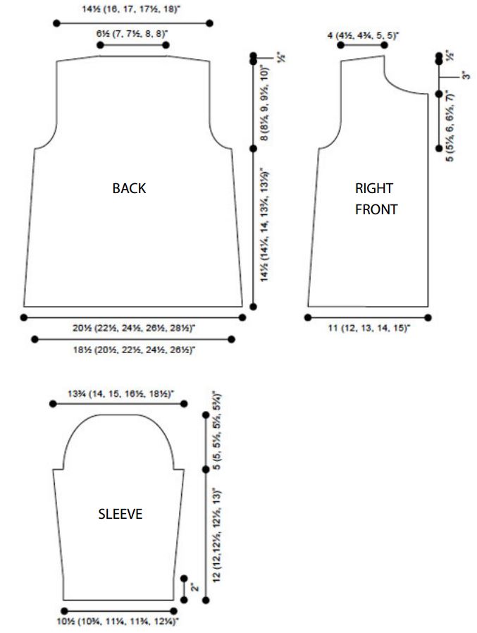 Bust: 37 (41, 45, 49, 53)" [94 (104, 114.5, 124.5, 134.5) cm].