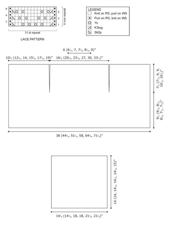 Working in Garter st on first and last 3 sts, and Lace Pattern as est on remaining sts, work even until piece measures 14 (14, 14 1/4, 14 1/2, 14 3/4, 15)" from beg, ending with a WS row. BO all sts.