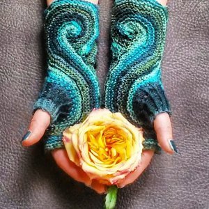 A swirling stitch design combined with a lovely variegated color palette create the Swan's Head Mitts. This beautiful fingerless mittens knitting pattern is knit in one piece beginning at the thumb. The shape of the swan's head is achieved by increasing the first part of a row and decreasing the second part, giving the pattern a figure-eight design. We think the swirl design shows best with a variegated yarn, but a solid color mitt would display the subtle beauty of these mitts as well.