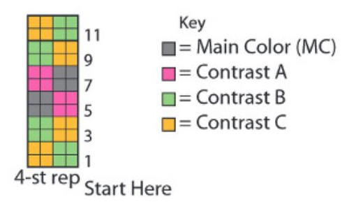 Change to MC; knit 2 (4, 6) rounds, pm every 18 (20, 22) sts on last round. -
