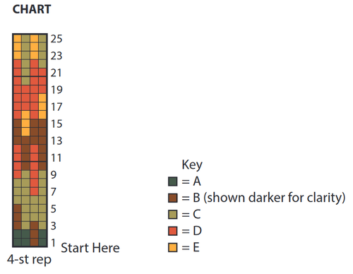 Next 3 rnds: With A, K1. *With B, K1. With A, K3. Rep from * to last 3 sts. With B, K1. With A, K2.Knit rnds 1 to 25 of Chart, reading rows from right to left, noting 4-st rep will be worked 18 times.