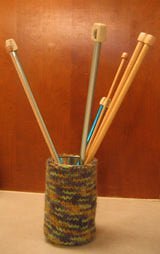 Hi! I made a knitting needle vase a few months ago, but it was for a more "Zen-like" atmosphere. I got a pretty clear-glass vase, filled it with translucent "marble beads" (from any craft store) and then used that to stick the needles in. I added my crochet hooks, too, and arranged them like a pot of flowers. At the other side of the shelf where they reside, I added a contrasting clear vase with the same color marbles, and added some long, purple faux fuschia-type plants. Together, they look like a nice, matched set. Very calming!