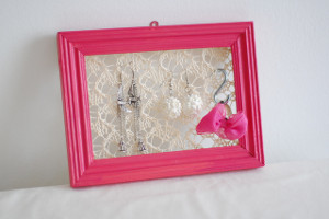 By now you’ve probably seen the homemade earring frame, made by stretching a piece of screen or lace behind an old picture frame. This delightful Lace Earring Frame takes that idea to a new level, and allows you to show off your earring collection and your knitting at the same time. This creative picture frame earring holder features a small square of lace knitted by you! Simply create the lace sampler and attach it to the back of your frame for a truly unique way to store your jewelry.