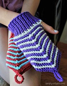 Doing the dishes just got a little more manageable with the Chevron Scrubby Mitts. This textured, knit mitten pattern is half scrubber, half mitt; making the perfect dish cleaning accessory. The Chevron Scrubby Mitts have an adorable striped stitch design and a practical loop for easy drying. These mitts are the quintessential kitchen accessory and make a great housewarming or bridal shower gift. They don't take long to stitch up, so knit a pair for yourself and a pal today.