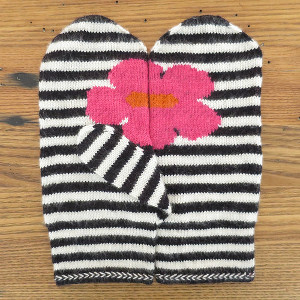 Use some flower power to help beat the winter chills with these May Flowers Mittens. This knitted mitten pattern will have you blooming with smiles. This black and white striped mitten pattern gets a pop of color with a pretty pink flower. When your hands are chilly in the wintertime, these gloves are a fun reminder that spring is on its way. These cheery flowers will brighten your day. These gloves would look adorable on a little girl. Knit a pair for yourself or as a gift for the little flower in your life.