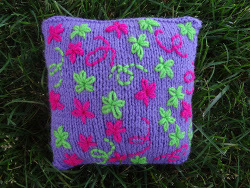 This cute pillow has several things going for it. It's easy to knit the solid front and striped back, and you can use whatever colors you like. The embroidered flowers and curlicues are simple, which is good for someone like me who doesn't have much experience with embroidery. Maybe it's time for me to take on this challenge!