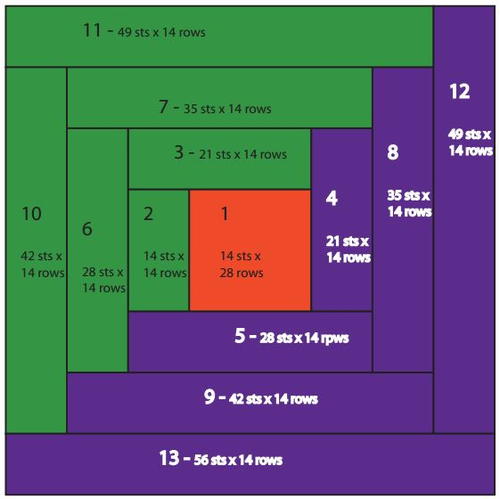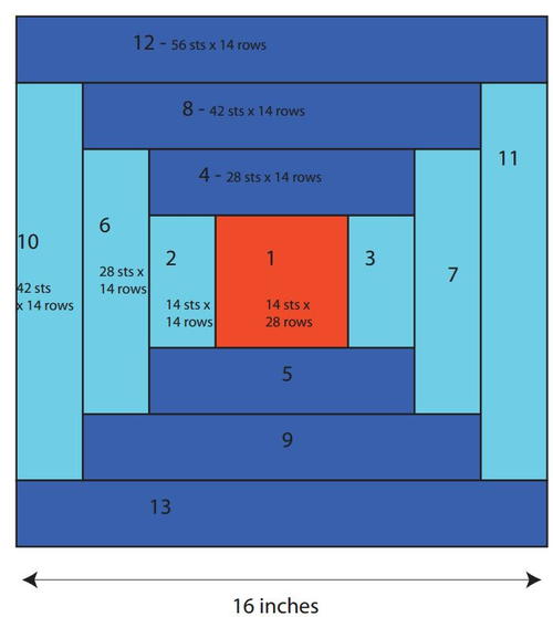 Side (13): With C, pick up & knit 7 sts along edge of Side 10, 42 sts along Side 9, & 7 sts along edge of Side 11 - 56 sts. Knit 14 rows. Bind off all sts. Continue in this manner, using diagram as a guide, until pieces 1-13 have been worked.