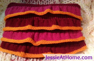 What a cute and fun pillow! Very unique too. I like that this cover buttons closed so you can take it off and wash it if you need to. I was wondering how the ruffles were made. It says you go back after you knit the cover and pick up stitches to add them on. Very clever!