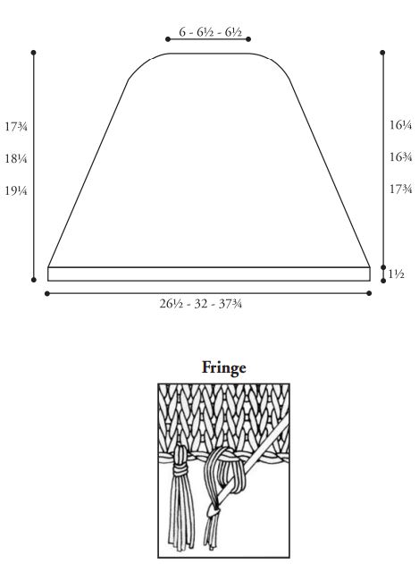 Fringe: Cut strands of MC 10 ins [25.5 cm] long. Taking 3 strands tog, knot into fringe 1 inch [2.5 cm] apart across lower edge of Poncho. Trim fringe evenly.