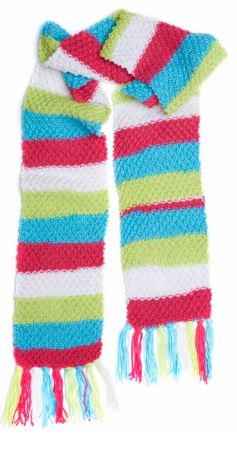 Whether you're new to knitting or just want a simple and fast knitting pattern, this Candy Shop Textured Knit Scarf is one to try! This knitting pattern is geared for beginners and is easy to memorize. It would also make a great last-minute gift idea for more advanced knitters to make. Bright and colorful as can be, this knit scarf pattern will bring to mind jars of sweets from your favorite candy store. This delightful scarf will look delightful with almost any winter gear. It can also be worn indoors as a fun accessory. You'll need a crochet hook handy for the fringe.