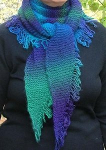 This beautiful knit scarf pattern is a great project for beginning knitters who only know a few stitches. The Garter Stitch Baktus is a lovely triangular-shaped scarf knit with a beautiful blue and green ombre yarn. This easy knitting pattern is a fun way to spend an afternoon. The best thing about the Garter Stitch Baktus is that it can be worn as a shawl or a scarf. It drapes nicely as a scarf because of the triangular shape, but it lays nice and flat as a shawl as well.
