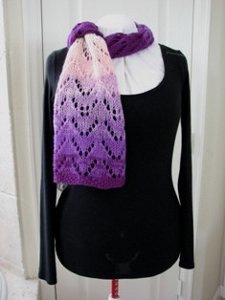 The Purple Waterfall Scarf is a great addition to any scarf addict's closet. Simple yet elegant, this lacy scarf pattern features a gradating color purple scheme, much like a mystical waterfall. This delicate, open stitched scarf goes great with a solid black shirt or over a dress to keep warm on a breezy summer evening. It makes a good project for beginning knitters looking to take on a more advanced project. This pattern features different shades of purple fingering weight yarn, but any color shades of fingering weight yarn would work as well.