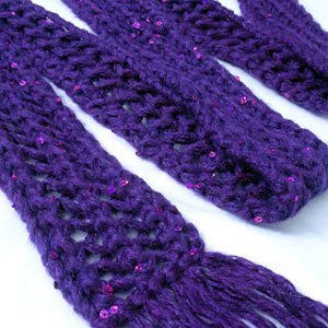 This cute little knit scarf pattern is the perfect way to add some glam to your outfit. The Skinny Sparkle Scarf is a fun purple scarf with flecks of tiny little sparkles and sequins. This glittery scarf is knit with super bulky yarn in a ridged lace stitch, giving it a great, open weave look. The Skinny Sparkle Scarf is the perfect party scarf, or just a fun way to mix up your daily outfit.