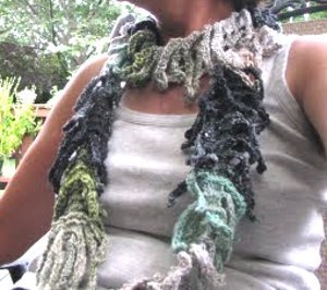 This Spanish moss scarf is a very busy little scarf just like its name sake which shows up on a lot of different things once it starts growingexcept that on the designers blog where you get the pattern instructions this is actually called the Spider Leg scarf. I can see that too.