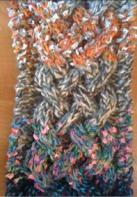 this would have been so much easier to see how the cables look if they hadn't used that odd combination of variegated yarns.
