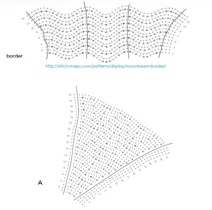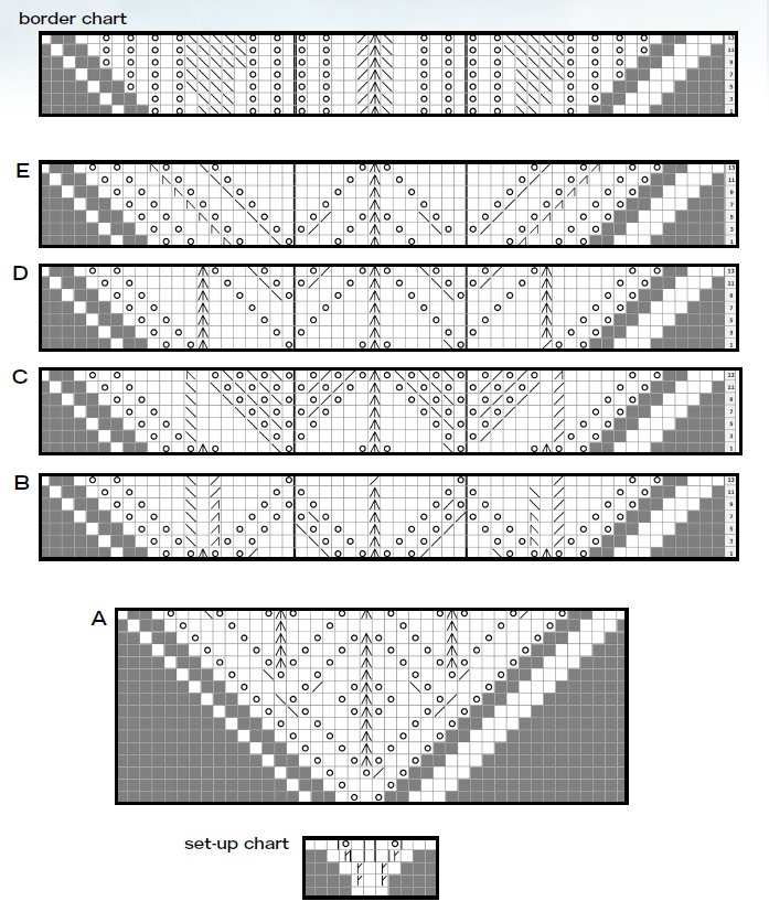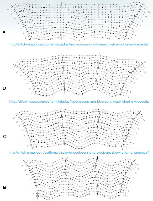 - The charts from B-E indicate instructions for the selvedge stitches, stitches between the 1st & 2nd markers including the increase areas and repeats plus the center stitch.