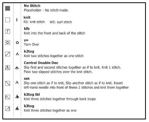 - Charts show Right Side rows only. Always knit 1st and last 3 stitches on Wrong Side. Purl all other stitches on Wrong Side between selvedge stitches.