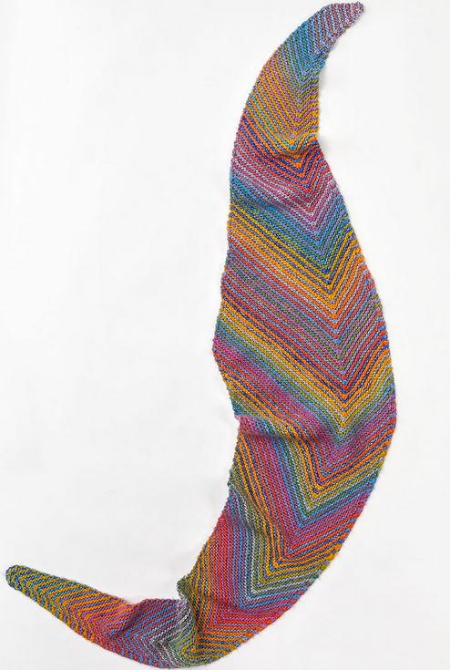 This shawl is worked alternating 2 rows of color A and then 2 rows of color B. Carry yarn not used loosely up edge, twisting it to avoid loops.