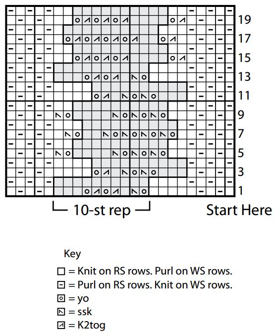 17th row: (K1. P1) twice. K2. K2tog. yo. *K2. (K2tog. yo) 4 times. Rep from * to last 6 sts. K2. (P1. K1) twice.