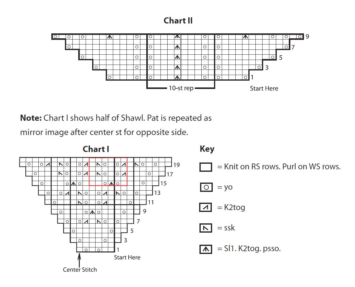 If working from Chart, note that sts in red box will be worked one more time in each repeat until there are 207 sts, ending with a WS row.