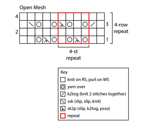 Gauge16 sts = 4” [10 cm] in Open Mesh pattern before blocking. 12 sts = 4” [10 cm] in Open Mesh pattern after blocking. CHECK YOUR GAUGE. Use any size needles to obtain the gauge.