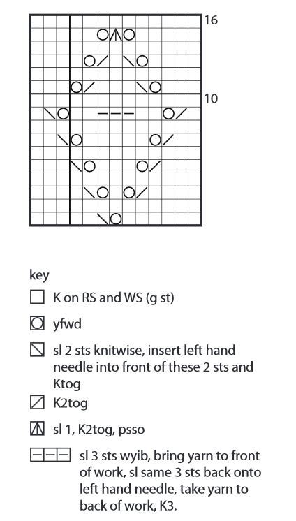 Row 11: K2, slip marker, yfwd, *K2tog, yfwd, rep from * to within 1 st of next marker, K1, yfwd, slip marker, work next 13 sts as row 9 of chart, slip marker, yfwd, *K2tog, yfwd, rep from * to within 1 st of last marker, K1, yfwd, slip marker, K2. 43 sts.