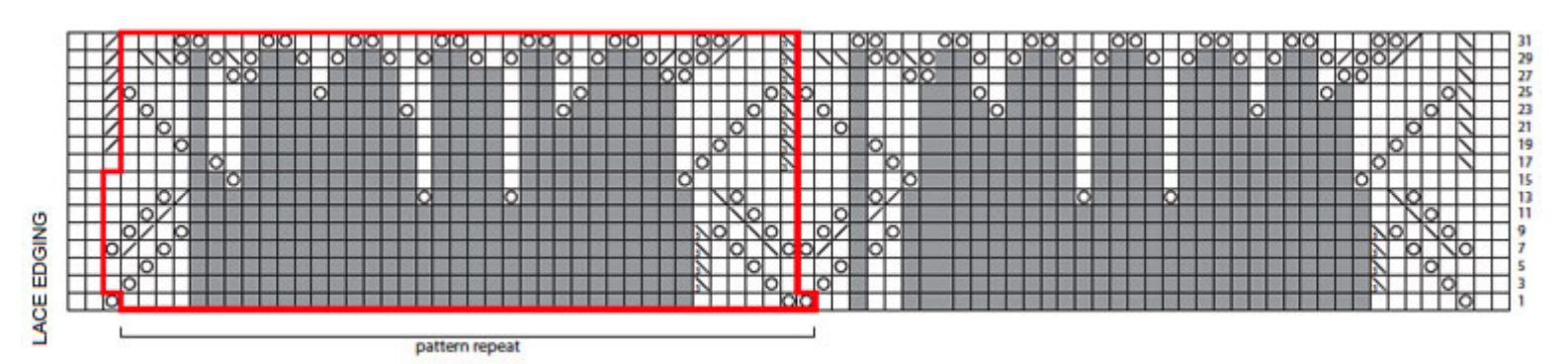 Note: Only RS rows are shown. On all WS rows, purl all sts and single yos; [p1, k1] all double yos.