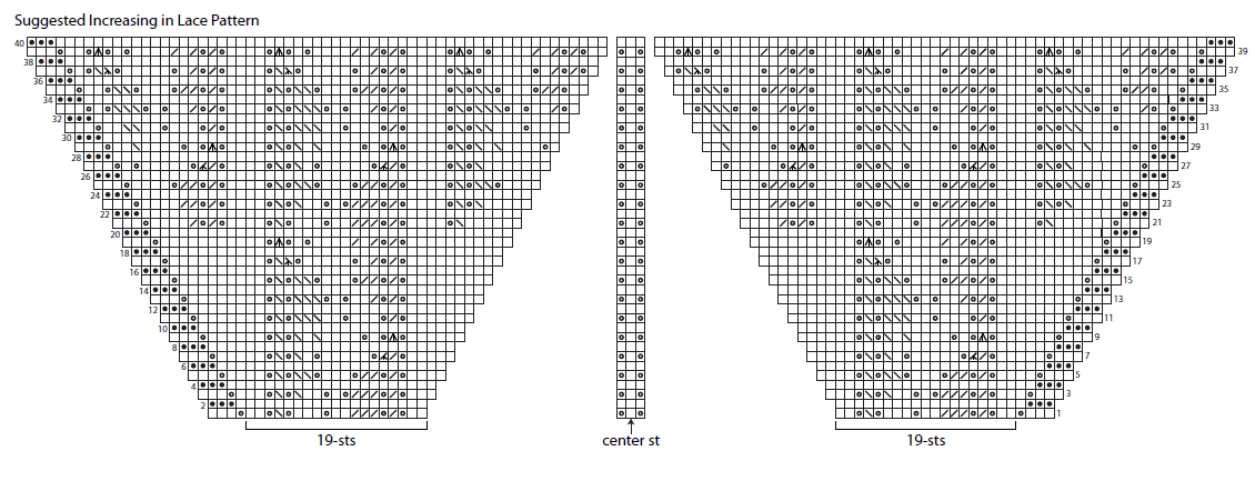 Note: You can increase until you have enough sts to work a complete (19-st) repeat of the Lace chart between the existing repeats. To introduce the new repeats more gradually, you can increase until you feel comfortable working partial Lace chart rows. There are many different ways to introduce the repeats gradually. A chart is provided showing one suggested increase pattern. When introducing repeats gradually, take care to work the same number of increases and decreases within the partial rows.